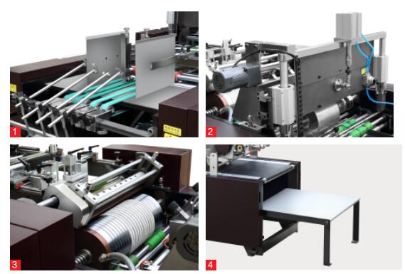 1.進紙部位由進口伺服驅動,間斷式皮帶進行底部抽紙輸 送,可不停機續(xù)紙,PLC 程序控制,人機界面,觸摸式輸入進紙長度,使送紙精確、快速,同時適用于卡紙和瓦楞紙。